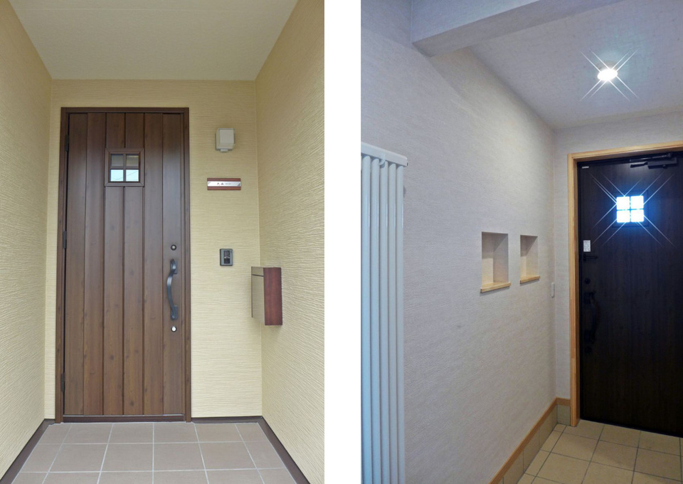 三角屋根の落ち着いた外観に、屋根付きの玄関ポーチ。小窓の付いた重厚な玄関ドアが出迎えてくれます。