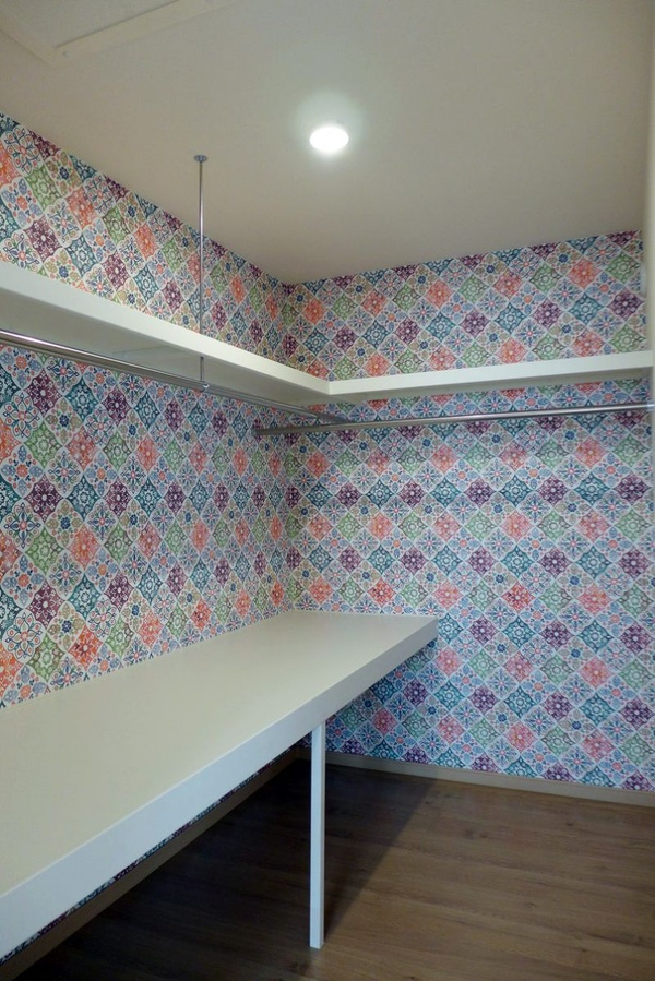 柄付きクロスで明るいウォークインクローゼット。収納しやすいように中板も付けました。