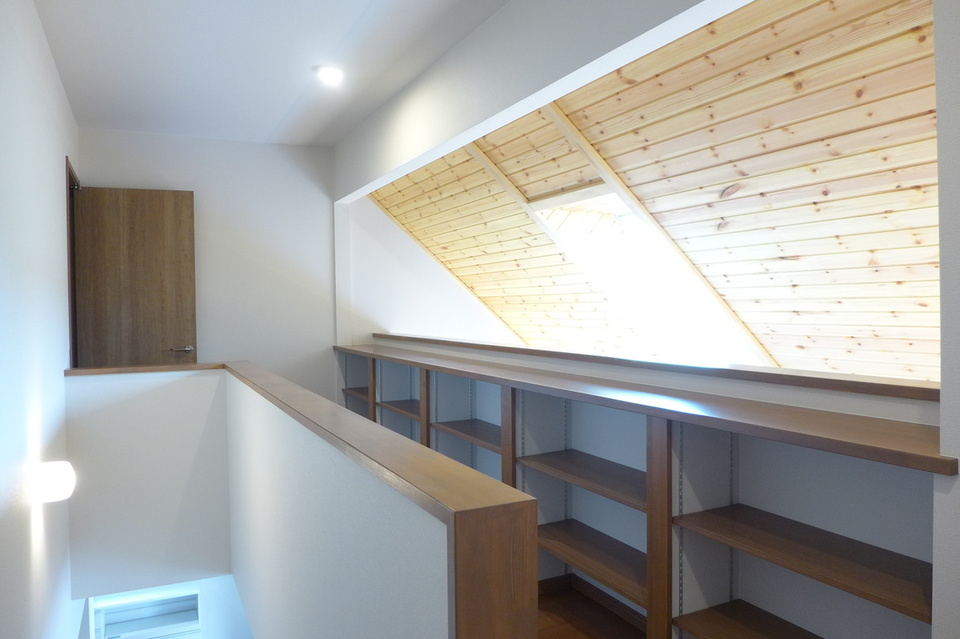 読書が好きなYさま。吹抜に面した2階ホールの腰壁には、可動式の本棚をご提案しました。