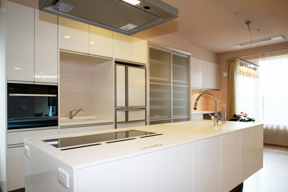 鏡面仕上げのホワイトで統一したキッチン。ダイニングは横並びの配置になります。