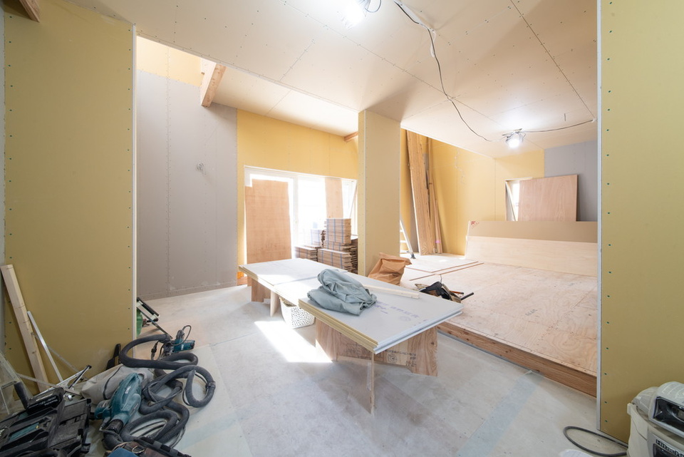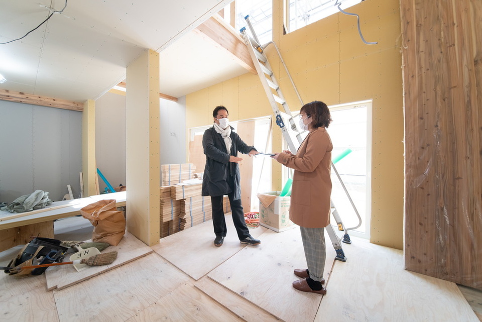 大工さんの休憩の合間にお邪魔した現場は、外装はほぼ完成したものの、内部はまだ床の構造用合板が貼られたままで、クロス貼りもこれから、という段階。「住宅の構造や機能をご説明するには、こうした施工途中の様子を見てもらいたいと思いまして」と篠崎社長。