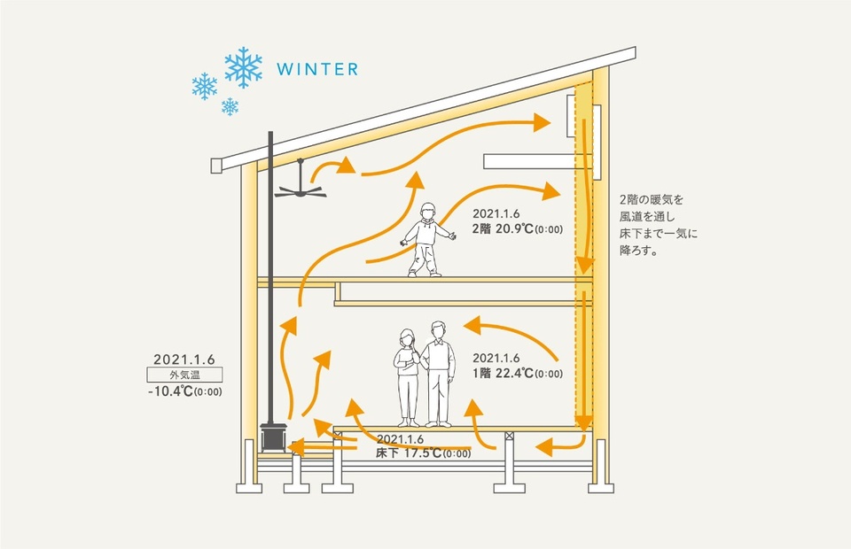 2階に上がってきた暖気は、室内壁に設けたガラリを通って2つのDCモーターファンで、さきほどの風道に送り込まれ、一気に床下まで下降。床下にも暖気が巡り、さらにその空気は床面のガラリや土間まわりのスリットを通って再び室内に入ってくるという仕組みです(図版2を参照)。