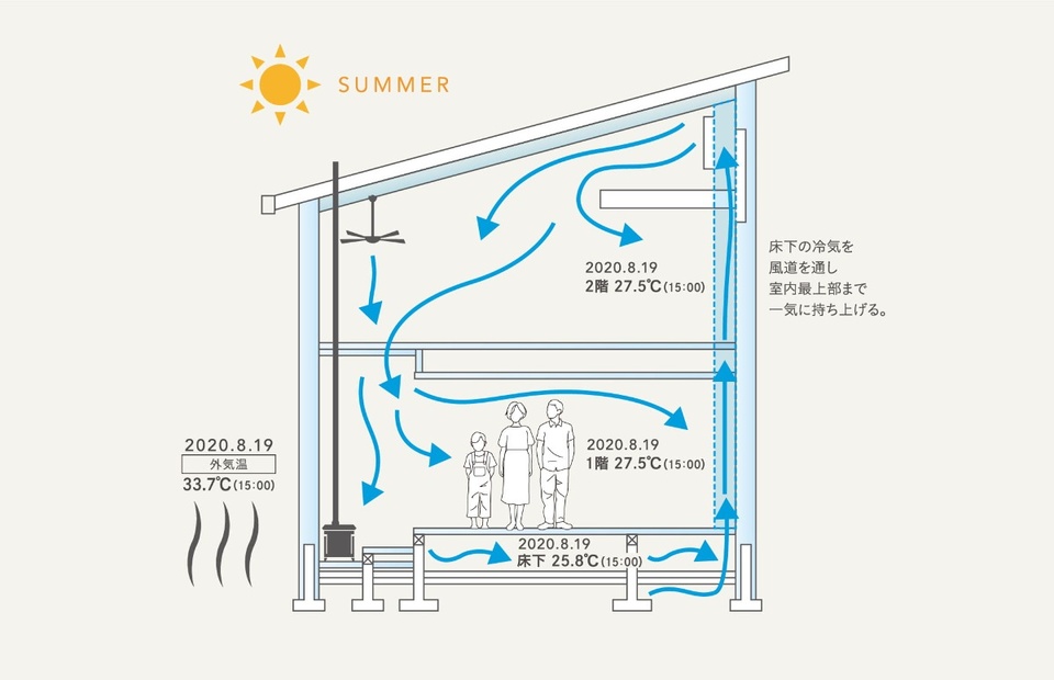 冷房は、夏でも18~20度に保たれる床下の冷気を、省電力のDCモーターファン2台を使って風道を通して2階天井近くまで一気に上昇させ、家全体に循環させます(弱運転で1台3w、使用頻度の高い強運転で4.8wほど)。人が快適に過ごせる25~28度のちょうどよい室温が省電力で叶う、特許申請中の技術です。