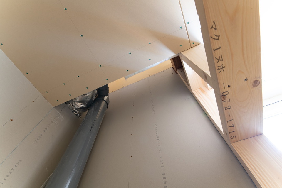 左/ペレットストーブを設置する吹き抜け上部の壁には、暖気の通り道となる開口部を作っています。