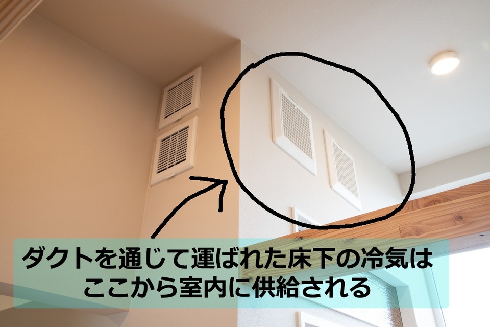 DCモーターファンでダクトに送り込まれた床下の冷気は、2階の高い位置に設けたガラリから室内に供給されます。冷たい空気は下降する性質があるため、自然と冷気は階下まで行き渡ります(図版1を参照)。