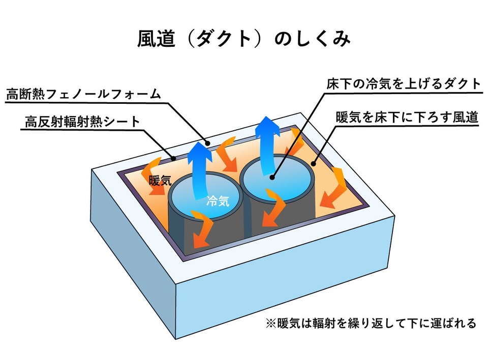 風道を囲う高反射輻射熱シートによって、床下まで輻射を繰り返しながら暖気が下降するのです。