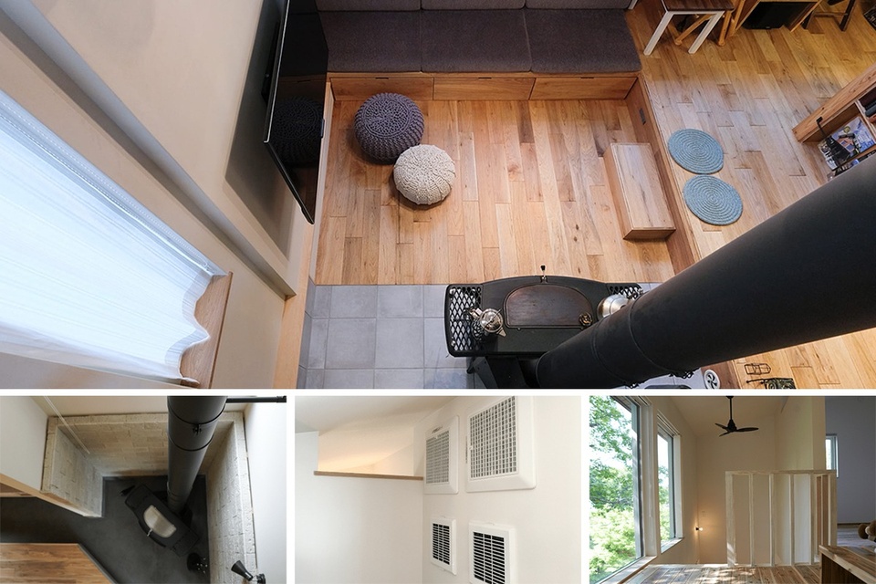 暖房は1台の薪ストーブなどが発する大量の輻射熱と自然体流を利用して、家全体に暖かい空気を循環させ、輻射と対流でじんわりと快適な暖かさを得ることができるのです。(輻射熱は人体も含めた物体の内部まで熱を浸透させる効果がある)