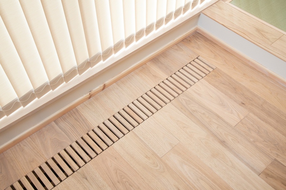 室内の空気を床下に送り込む床ガラリは全部で4カ所設置されました。こちらは大きなリビング窓の手前に配置されたもの。無垢床に合わせた木製です。