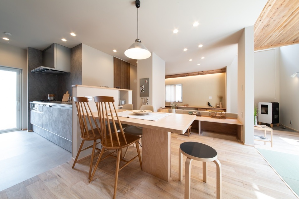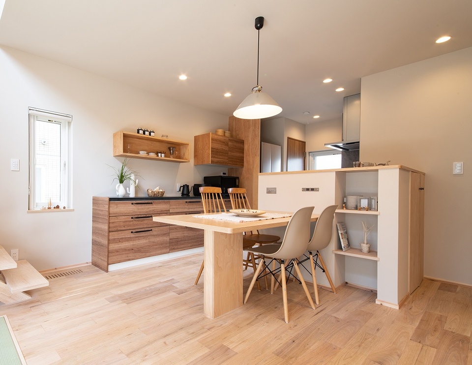 ダイニングテーブルと一体化した収納付カウンターは奥行きがあり、買い出し後の食材を一時置きできるよう配慮されています。高断熱・高気密で冬の室温が高く保たれるため、キッチンの背面には保冷庫も備えています。