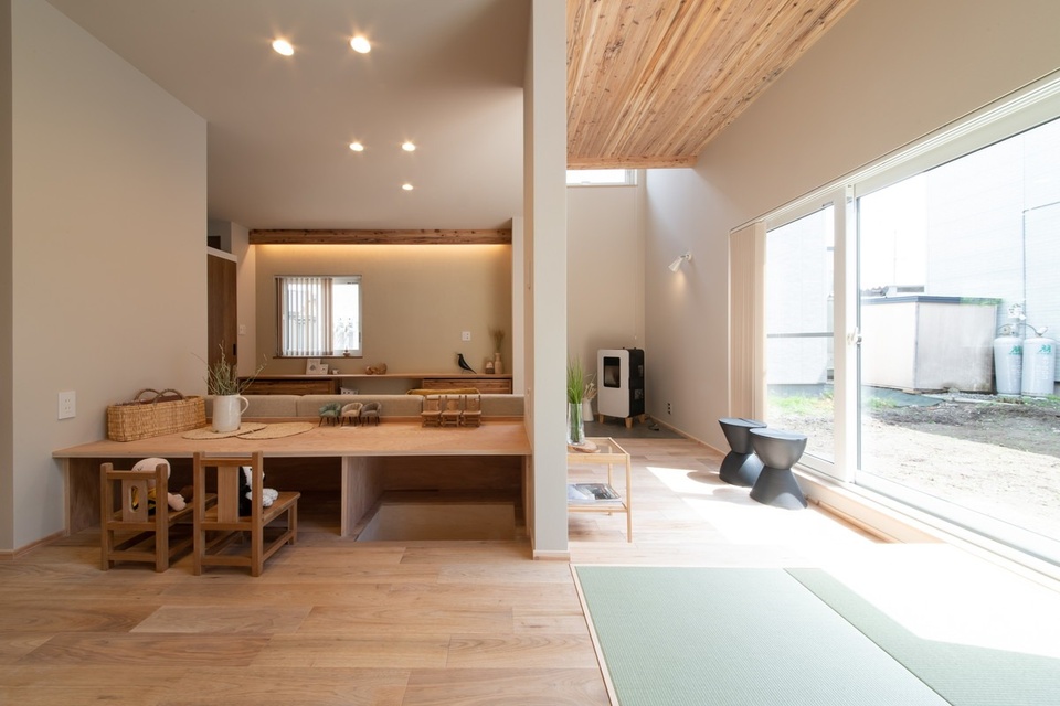 右/階段下にはリビングから15cm上がったところに畳コーナーを設けました。お子さんのプレイスペースとしても重宝しそうです。