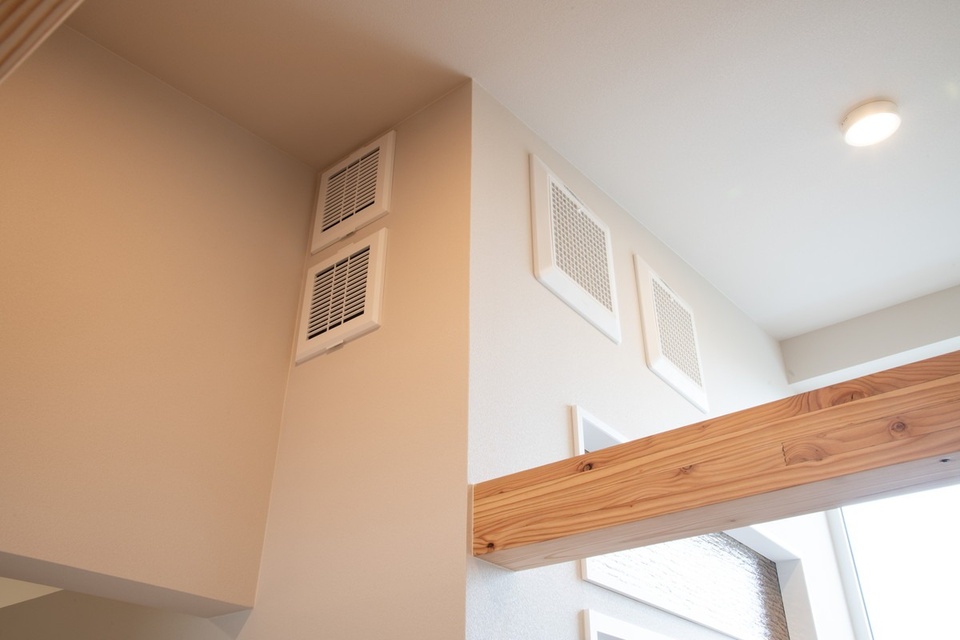 2階ユーティリティーの上部は建物屋内の最上部になっていて、室内の暖気を取り込むガラリ(左手前上下2か所)と、床下から運ばれた冷気を室内に送り出すガラリ(右上2か所)が設置されました。