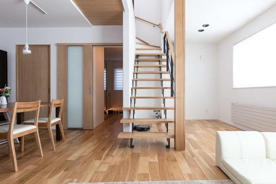 黒のアイアンと木を組み合わせた開放的な透かし階段。圧迫感がなく、お部屋も広く見えます。「キッチンから見た時、視線が通るデザインにしました(ご主人)」。