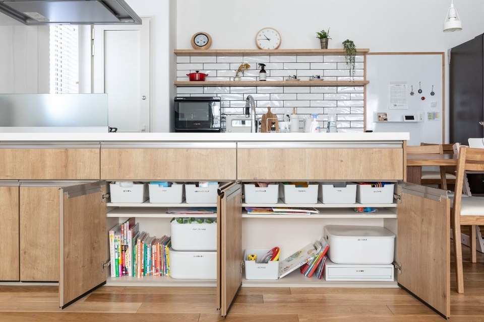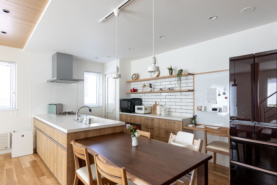 キッチンの背面にはロータイプのカップボードを設置。その上に飾り棚を造り付けました。白のサブウェイタイルをあしらって上品な雰囲気に。