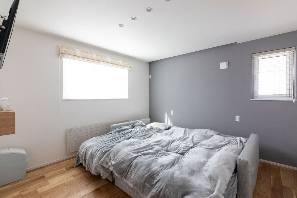 主寝室はグレーの濃淡でシックに。「新築の記念に寝室と子供部屋のカーテンと同じ生地で作ったクッションをプレゼントしていただきました。リビングで大切に使っています」。