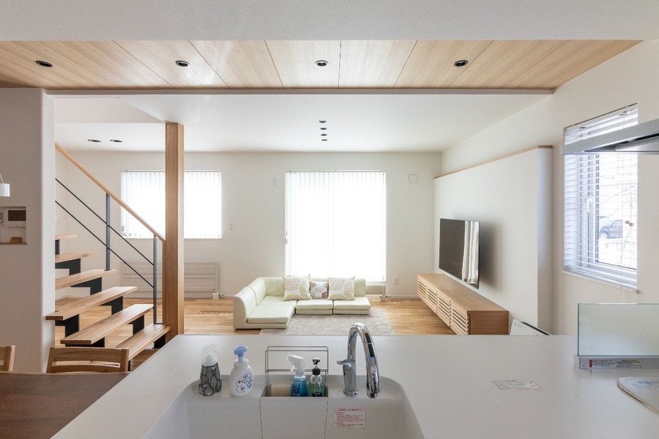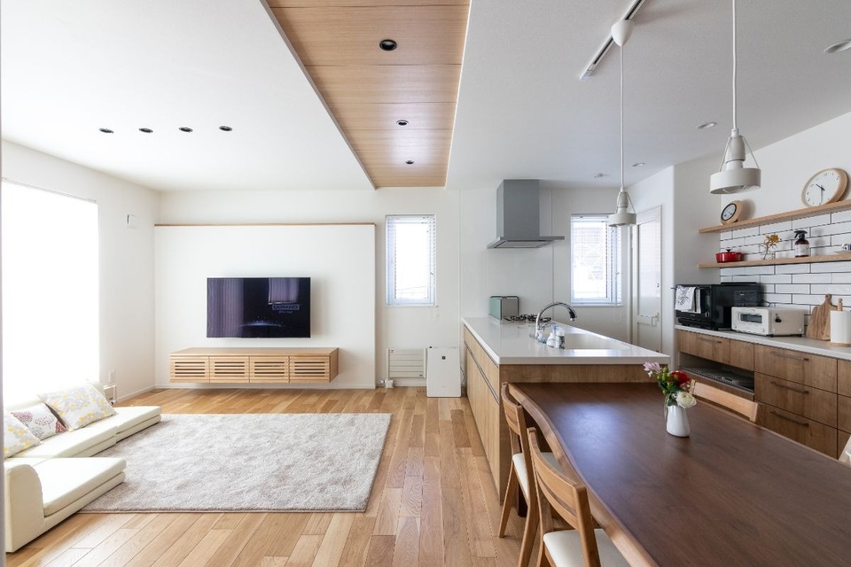白のインテリアと木のバランスが絶妙なリビング。天井を一部板貼りにし、入り口から縦方向のラインを作ることで奥行きを深く見せています。