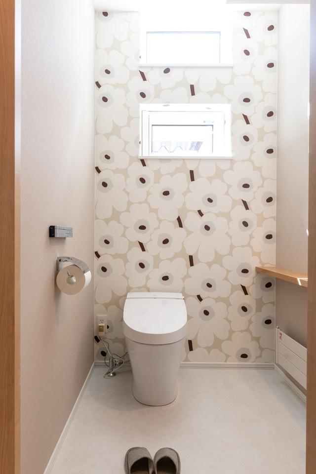 ユーティリティ向かいのトイレ。マリメッコの花柄のクロスをアクセントに使いましたが、旭川市内での取り扱いがなく、お取り寄せに。