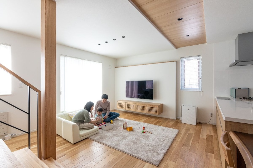 仕事に子育てに忙しい共働きのご夫婦が建てた買い物に便利な住宅地の中の木のぬくもりに包まれた住まい。