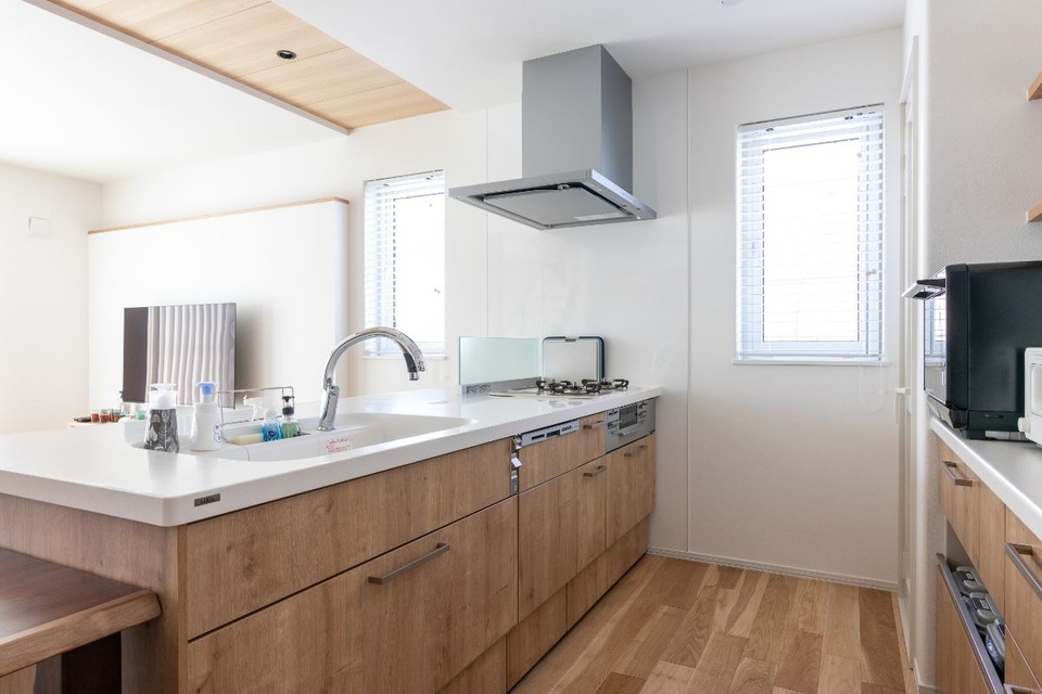 キッチンはワークトップがフラットなアイランド式を選択。キッチンのキャビネットやカップボードなどは木で統一しました。水廻りは全てタッチレス水栓。