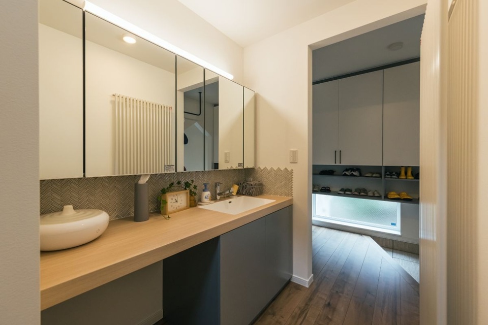 家族用玄関はそのまま洗面所、そしてパントリーへと続いています。汚れや荷物をLDKに持ち込まないため、考え抜かれた動線です。