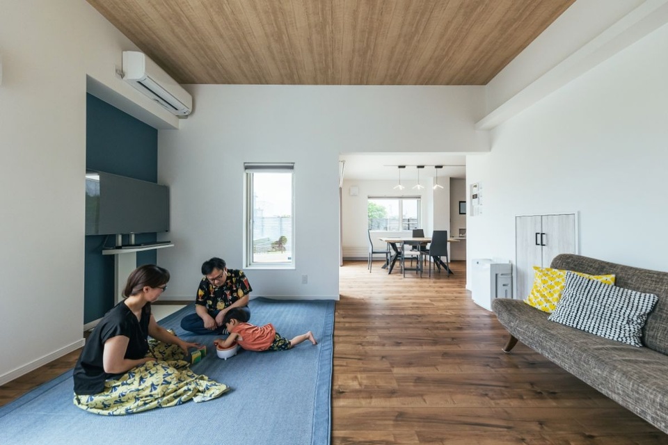 リビングと「扉」ではなく「段差」で区切られたキッズスペース。空間を共有しつつも境界がはっきりとしているのでおもちゃがリビングに散らからず、子ども達も思い切り遊べるのだそうです。