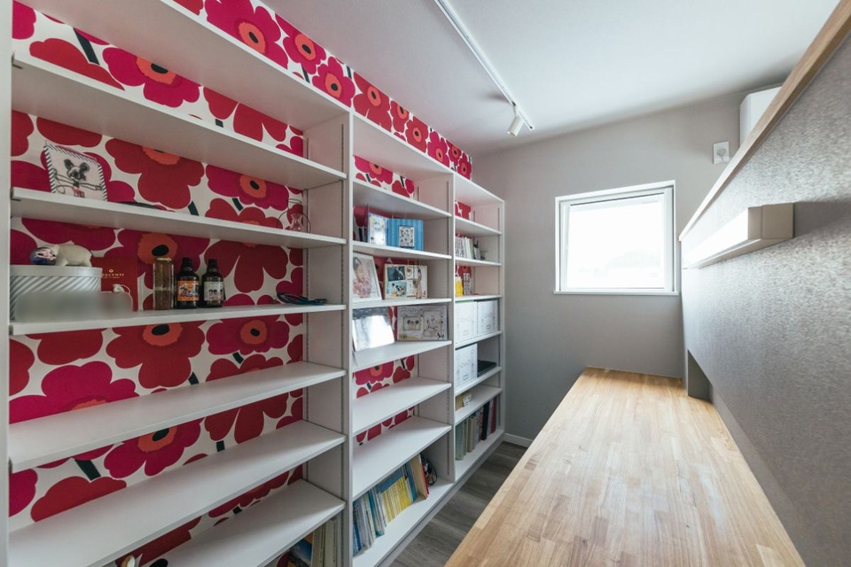 明るいパントリー(写真左)と落ち着いた雰囲気のファミリークローゼット(写真右)。「インターネットでダウンロードした壁紙見本を、紙で作った模型に貼って印象を確かめました」(奥様)と、万全なイメージ作りを行ったおかげで思い通りの仕上がりになりました。