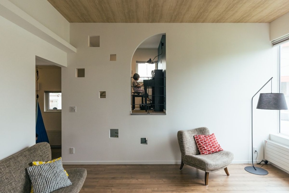 いつもの練習風景も、くり抜かれた壁の向こうに見えることでまるで舞台で弾いているかのような印象的なシーンに。奥様の誕生日にはお嬢さんがピアノの演奏を披露するなど、音楽のある日常を楽しく演出してくれる空間となっています。