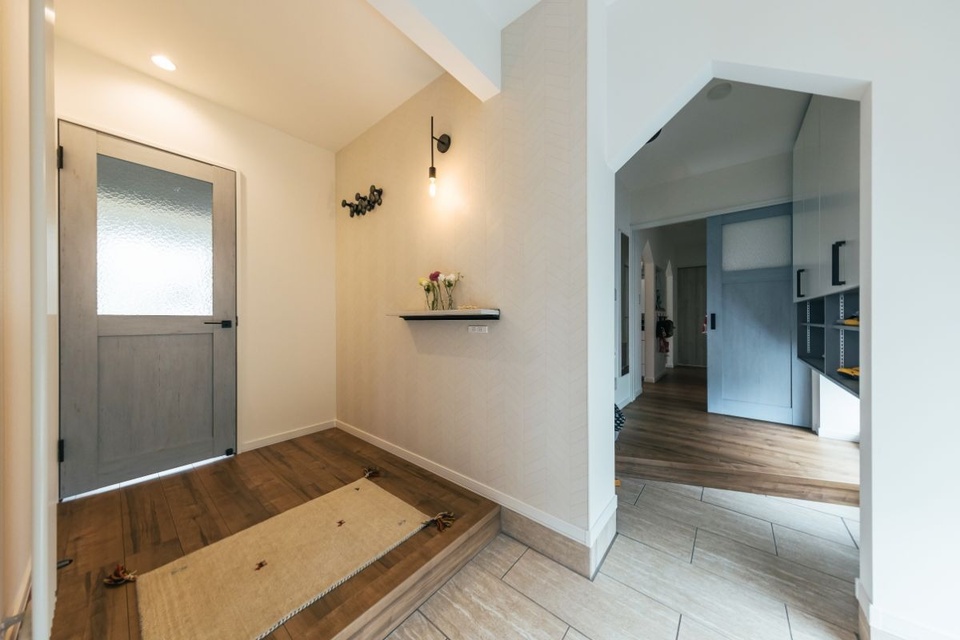 「お客様を気持ちよくお迎えできる”エントランス” を作りたかった」と、玄関はホールがふたつある造りにしました。家族用玄関(写真右側)はあえて扉やカーテンで仕切らず、生活感を隠しつつも奥行きを感じさせる空間使いです。
