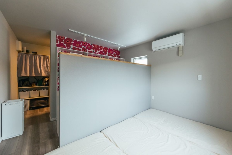 鮮やかな花柄のマリメッコ(marimekko)の壁紙が。「アクセントクロスは、使うなら中途半端なものではなく、思いきりアクセントになるものを使いたかった」と、カタログだけでなくメーカーのホームページを隈なくチェックして選びました。