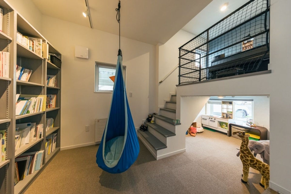 例えばこの部屋の場合、本好きのお子さんのために、左側には壁一面の本棚、右側にはおもちゃで遊べる小部屋。その上はスキップフロアになっていて、ピアノの練習スペースがあります。