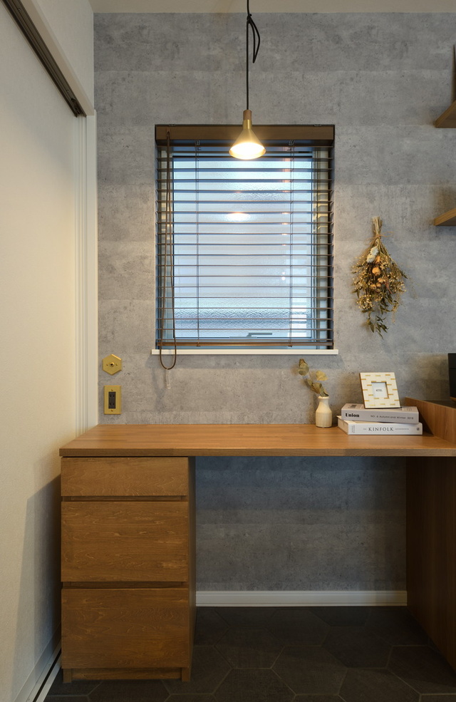 背面収納の続きには引き出しの付いた作業スペースを希望しました。奥さまはもちろん、お子さんが就学後は勉強スペースとして使う予定です。
