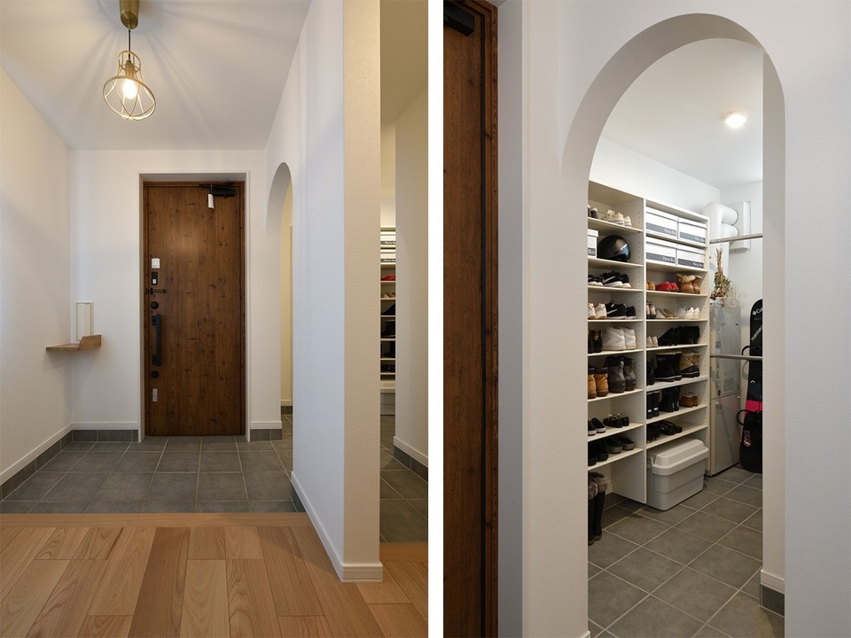 玄関は来客用のメイン玄関のほかに、大収納のシューズクローゼットとつながったファミリー玄関も備えています。クローゼット出入り口のアーチの下がり壁はモデルハウスで気に入って採用したデザインです。