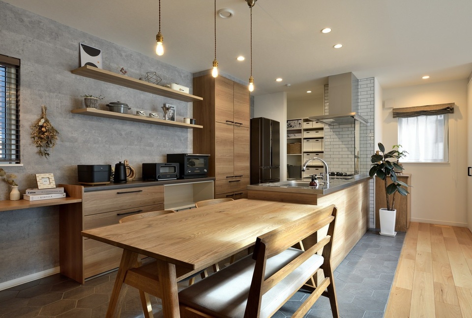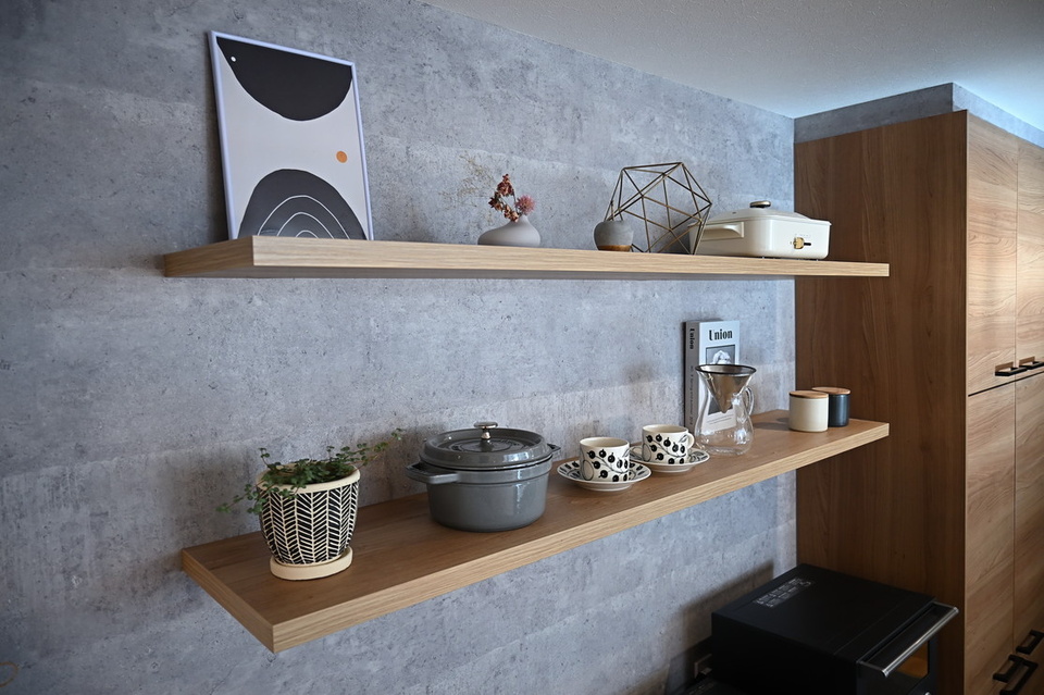背面にはコンクリート柄の壁紙をチョイス。木目調の収納やフラットシェルフが映える奥さまお気に入りのポイントです。