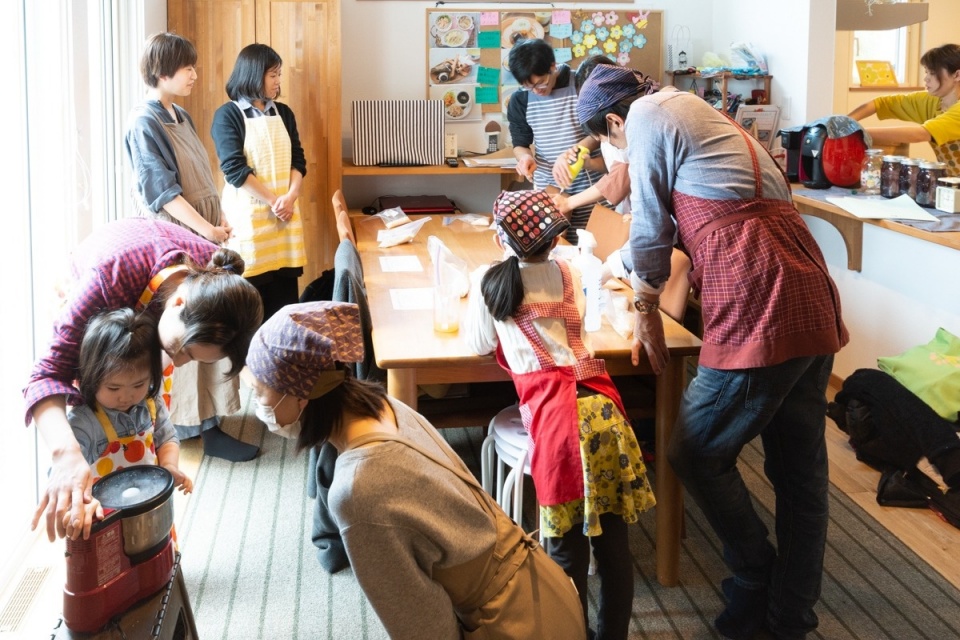 さっそく園田奈緒先生による保存食(みそ作り)教室が開かれていました。日頃から離乳食や幼児食の先生をされているので、子育てママ・パパがお子さんを連れて参加することが多いこともあって、今回はいつもとは違う内容ですが、やはり親子連れの参加が多いようです。