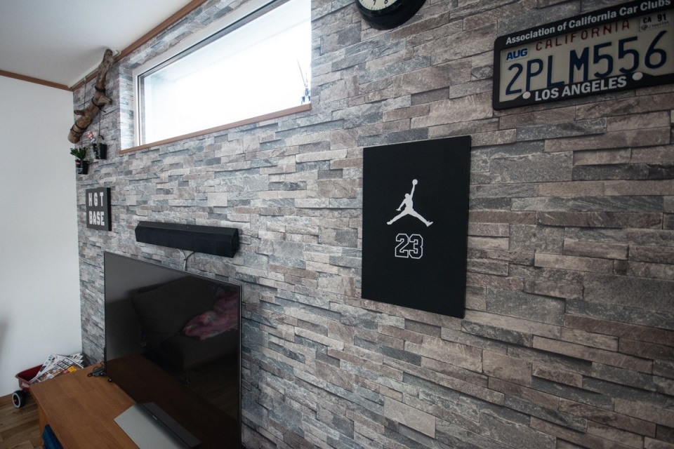 石壁を施工するとかなりコストアップになります。ダイニングや水槽、ガレージなどに予算を確保するためにも、ここは実は石壁風のクロスを採用しています。でも本物そっくり。
