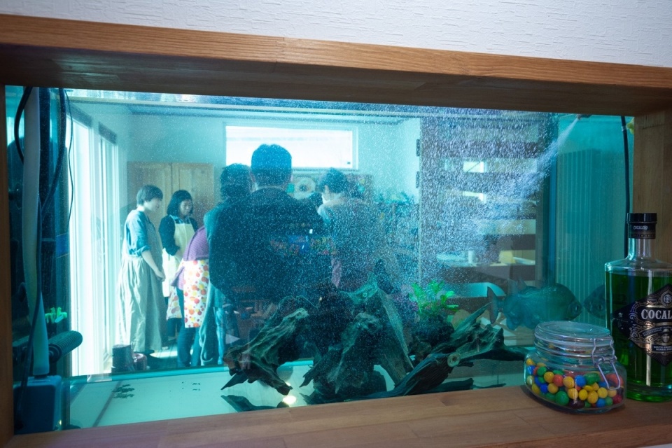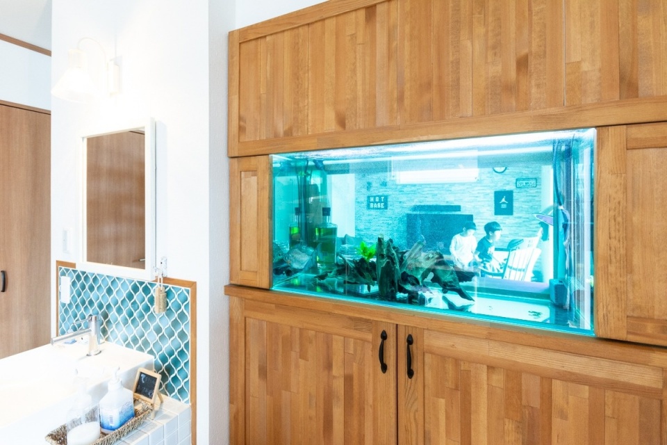 逆にリビング側からも水槽を通してダイニングが覗けます。ちなみに筆者の場合は、自宅リビングに水槽を設置していますが、水槽は配線や備品も含め場所を取り、水替えとかメンテナンスで周囲に水はねを起こし、綺麗に管理しないと見栄えが悪化し、音の問題も多少あるということで、いろいろ家族に気を使います。家庭によっては、リビングに水槽を置くことを禁止され、ご主人の部屋に、というケースもあります。