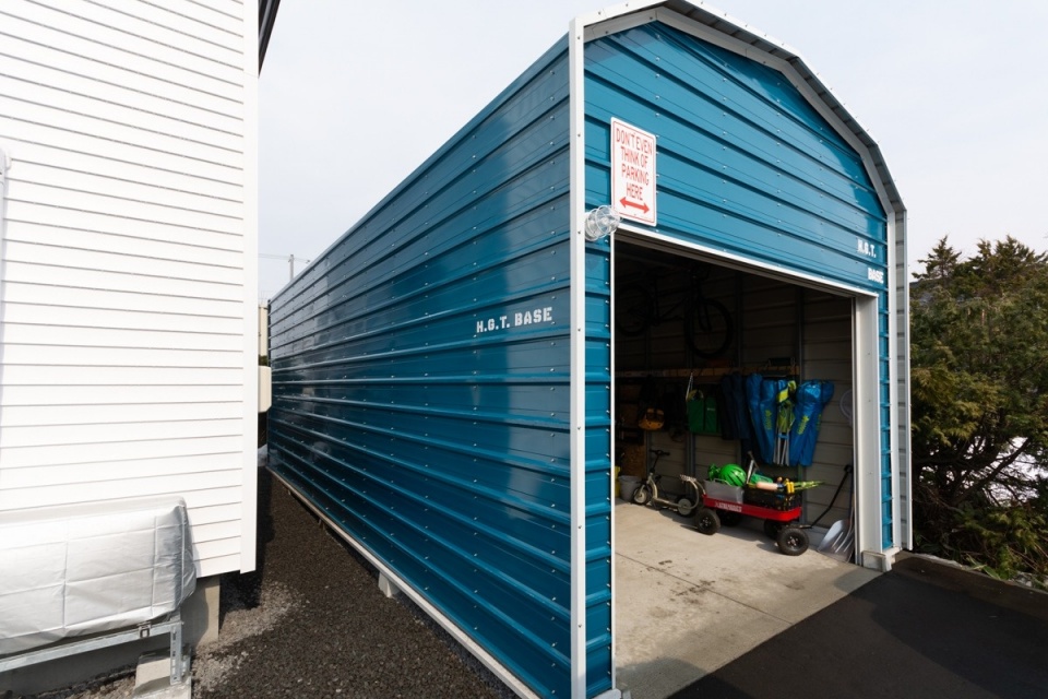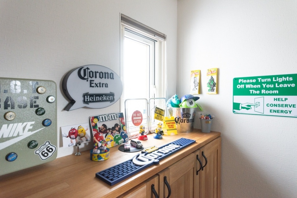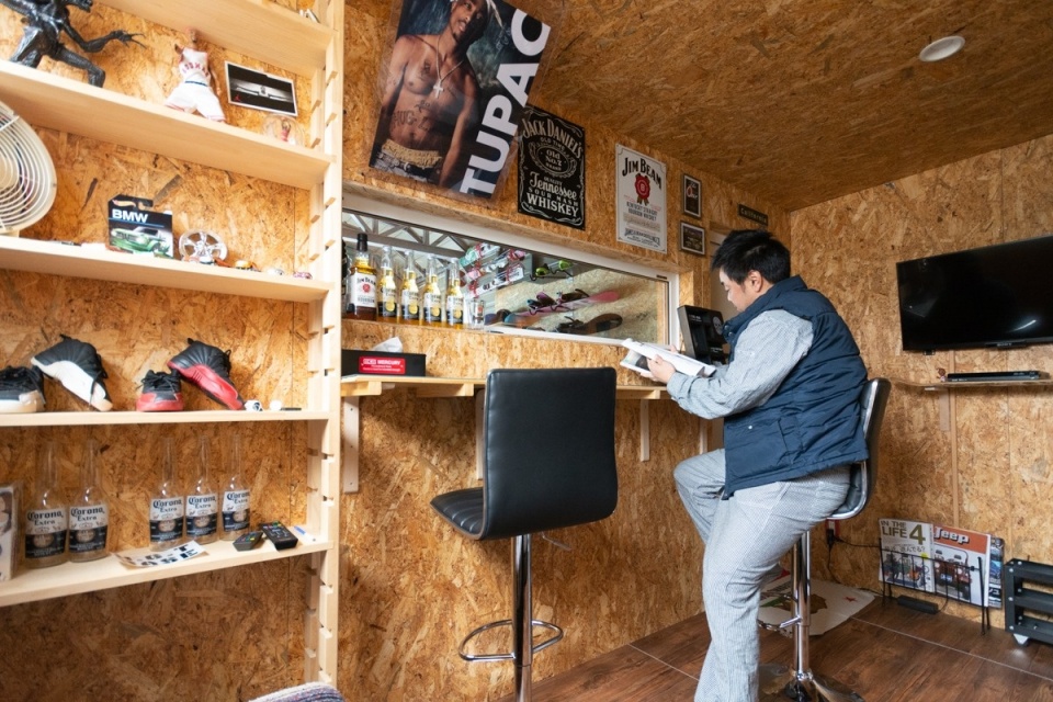 ガレージ内部に、木造で小屋を作ったのです。好きなスポーツのグッズなども並ぶお気に入りの空間です。