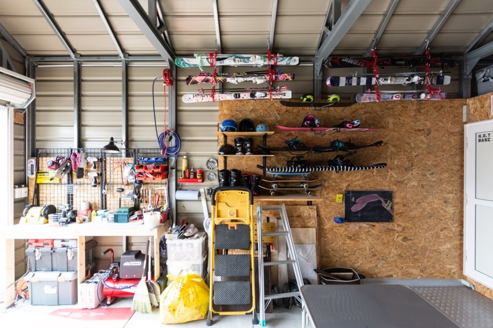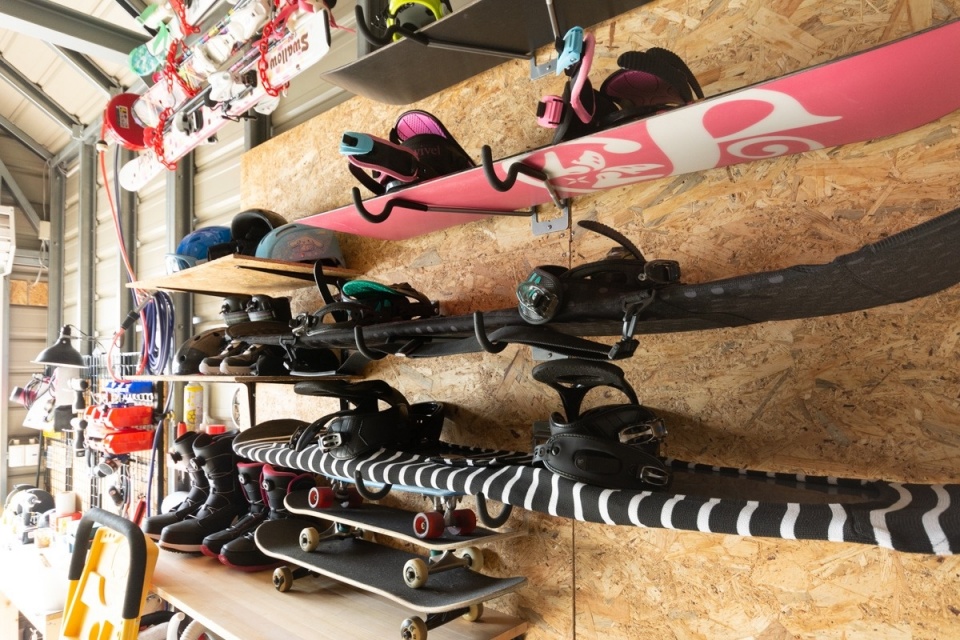スノーボードやスキーなどのアウトドア用品は壁に設置、保管できます。