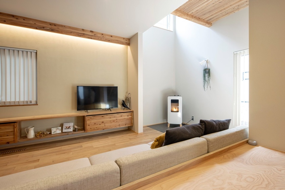 主人のお父さんが大工の棟梁としてこの家の建設に携わってくれて、思い出深い家づくりになりました。洗面台やソファー、収納など、使いやすさやデザインにこだわった造作家具も気に入っています。