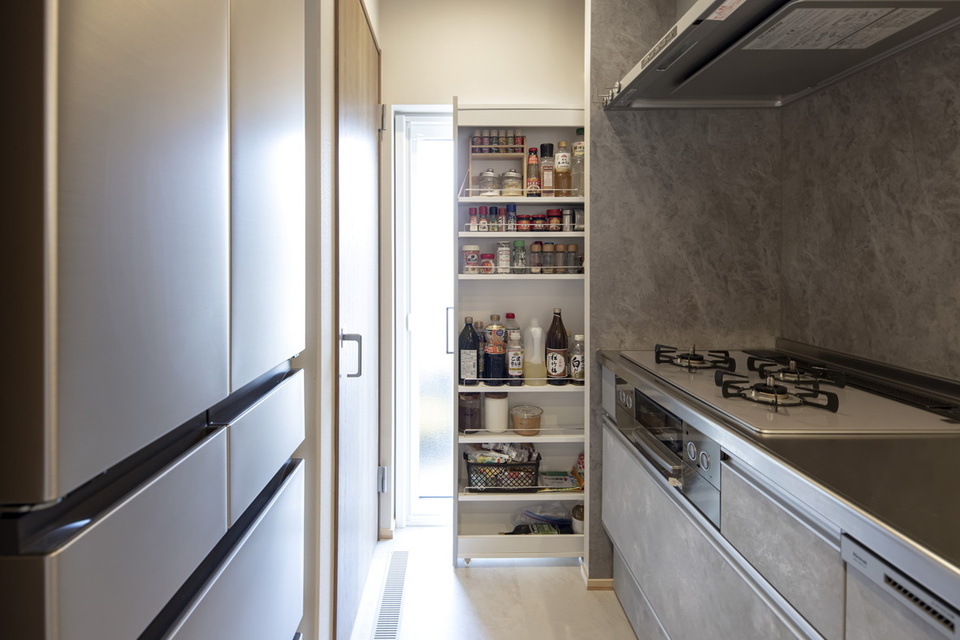 キッチンの奥にある隙間を利用した薄型ラックも重宝しています。勝手口はゴミ出しのほか、宅配で大きな荷物が届いた時の受け取りなどにも便利です。