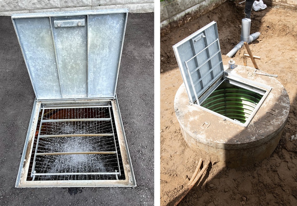 左/融雪槽の蓋を開けると、中は地下水が噴射されています。冬はこの地下水を使って融雪を行います。