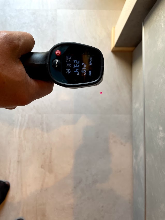 タイルを貼ったキッチンの床表面温度は23.4度でした。床ガラリは開閉式になっているので、隙間の大きさを調整して、室温温度調節が可能です。