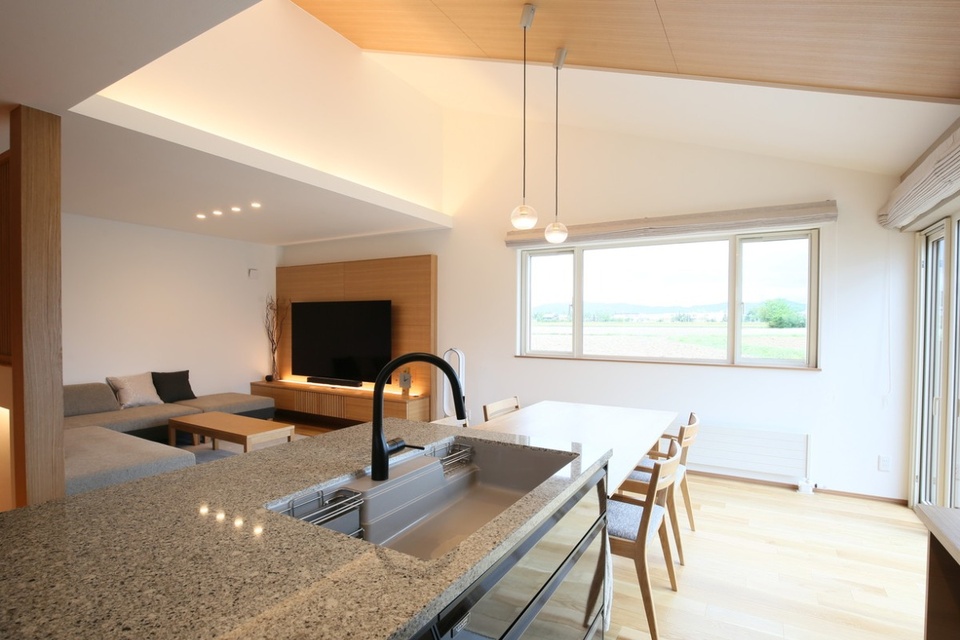 ダイニングチェアに腰掛けた目線の先に、田園風景が広がります。家の前の道路や人の往来が見えない位置に窓を配し、美しい風景だけを切り取りました。