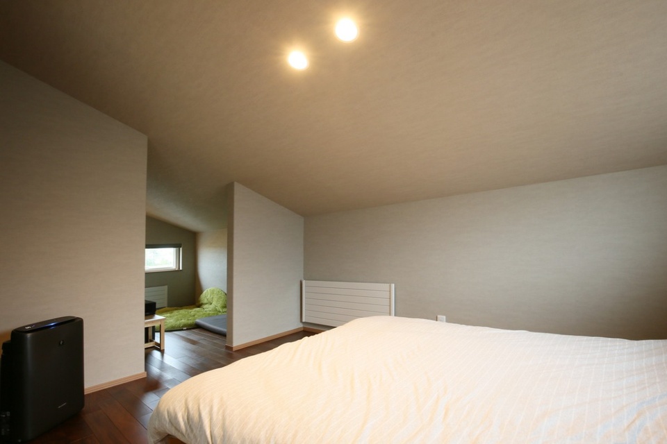 片流れの傾斜屋根を生かした寝室には、続き間に奥様のご希望で小さくて天井の低い隠れ部屋を造りました。テレビと冷蔵庫を置き、休日はここでのんびりすることも。小さな窓から見える畑の景色に癒やされたり、部屋を暗くしてお酒を飲みながら映画鑑賞したり……。小部屋を盛り込む設計は、林さんの得意とするところです。