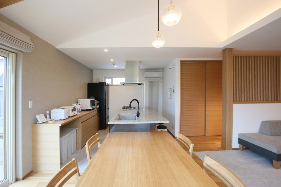 また、勾配天井は全面に木材を使わず、あえて部分的に使うことで木の質感を生かしました。木の良さが埋もれないよう、時には引き算することも設計の大事なポイントです。