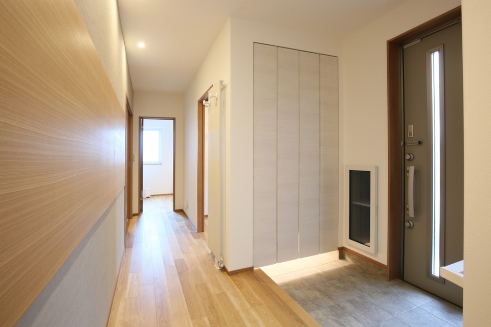 玄関正面の壁を横長に貫くタモ材の突き板のデザインは、ご主人が街で見かけて気に入った壁のデザインがアイデアの素に。また、玄関の上がり框は、同居するおばあさまのことも考えて低めに仕上げたほか、気密性を損なわない住宅壁貫通型の宅配BOXを備えました。