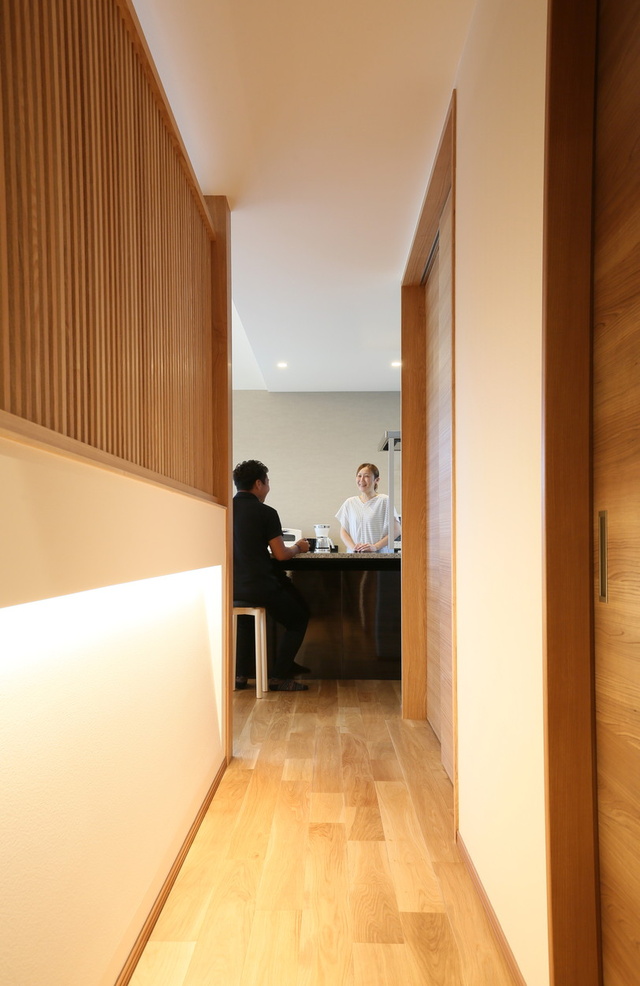 LDKに続く扉の先に広がるのは、訪れる人が驚くような非日常の風景です。タモ材の縦格子や、陰影が美しい間接照明は和風旅館のような佇まい。そして、目の先に飛び込んでくるのはスタイリッシュなキッチンです。生活感をなくしたいというご夫婦の希望が、大胆な設計に反映されています。