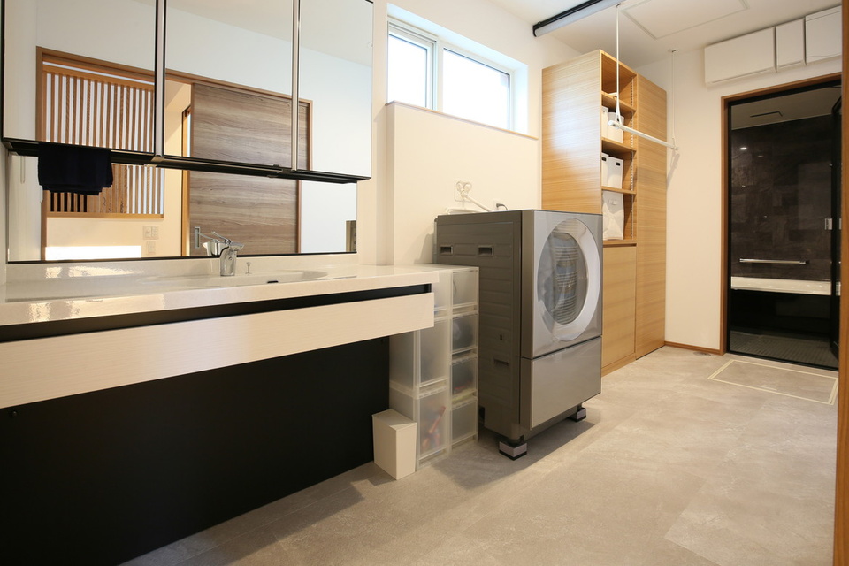 LDKからアクセスでき、おばあさまの個室からも使いやすい位置にある広々としたユーティリティー。モルタル調のフロアタイルや、バスルームのガラス扉でリゾートホテル風の佇まいです。入浴の際の脱衣時は天井からスクリーンを下ろせるようにしています。