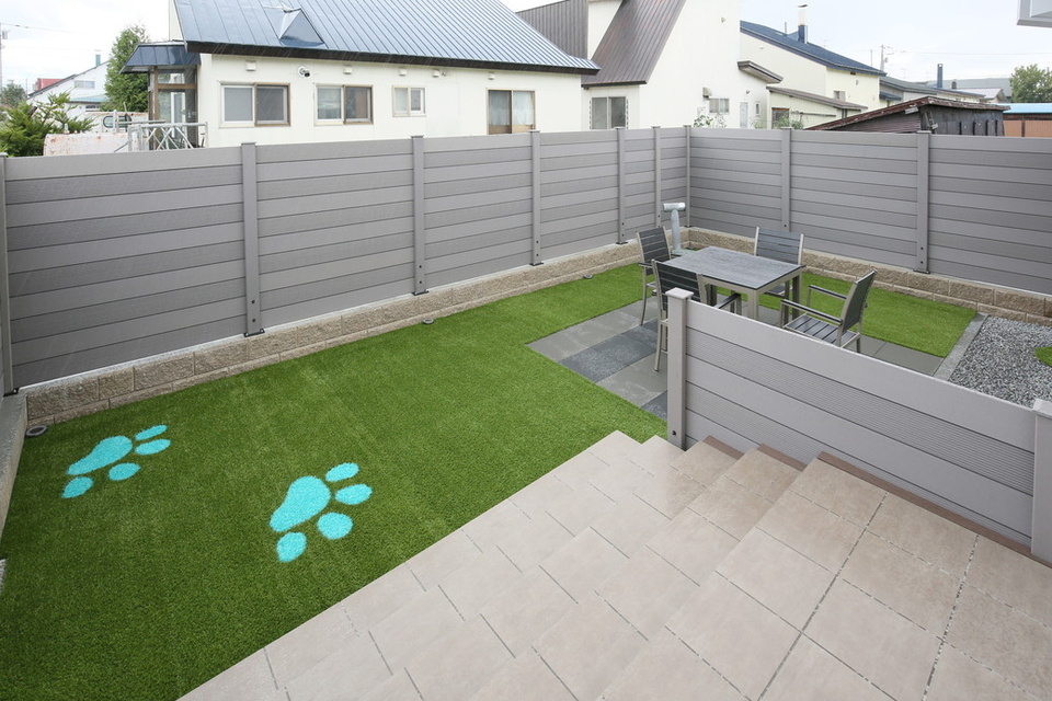 庭にはドックランを整備。小さなワンちゃんたちが上り下りしやすいよう、外の階段は段差を低めにしました。