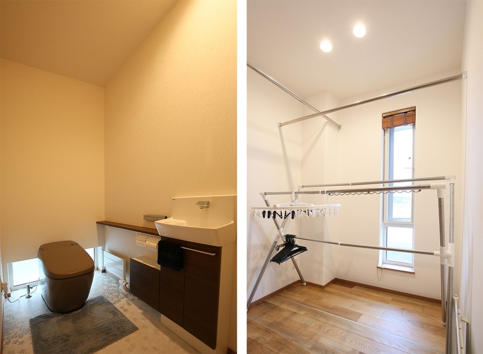 右/玄関横にある洗濯物干し室。以前の家では、ワンちゃんが遊ぶお部屋に洗濯物もあったので、新居はそれぞれ独立したスペースを造りました。