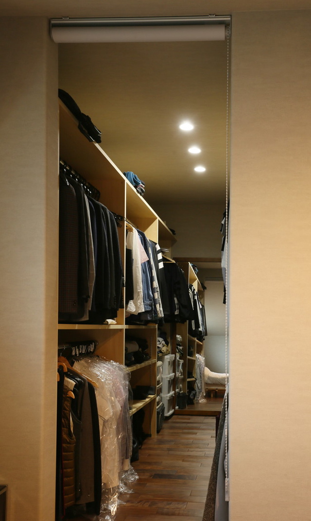 寝室から続くウォークインクローゼットは、収納棚を造作し、天井までのスペースを無駄なく活用。奥には手持ちの鏡を置き、入口はスクリーンで仕切れるようにしています。家の壁の角はすべてがアール状になっており、手間を惜しまず上質さと、傷が付きにくい機能性を共存させています。